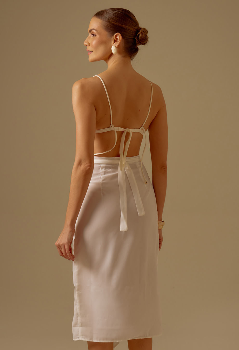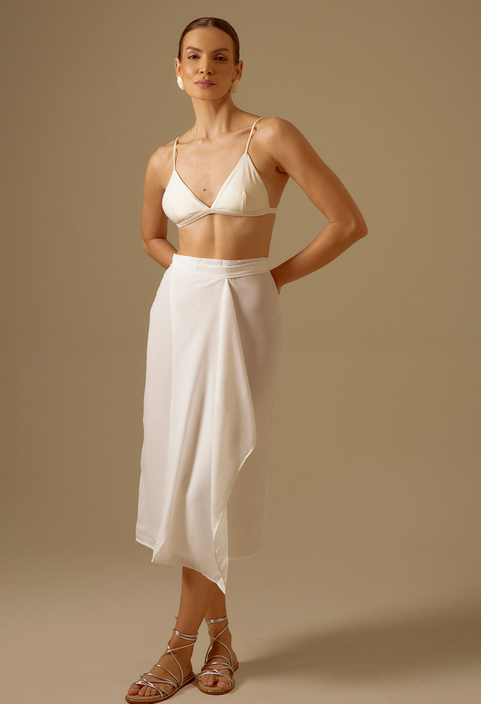 +Saia midi off white com cintura alta e drapeado frontal que valoriza a silhueta. Tecido leve e fluido ideal para looks de moda praia e casual, combina