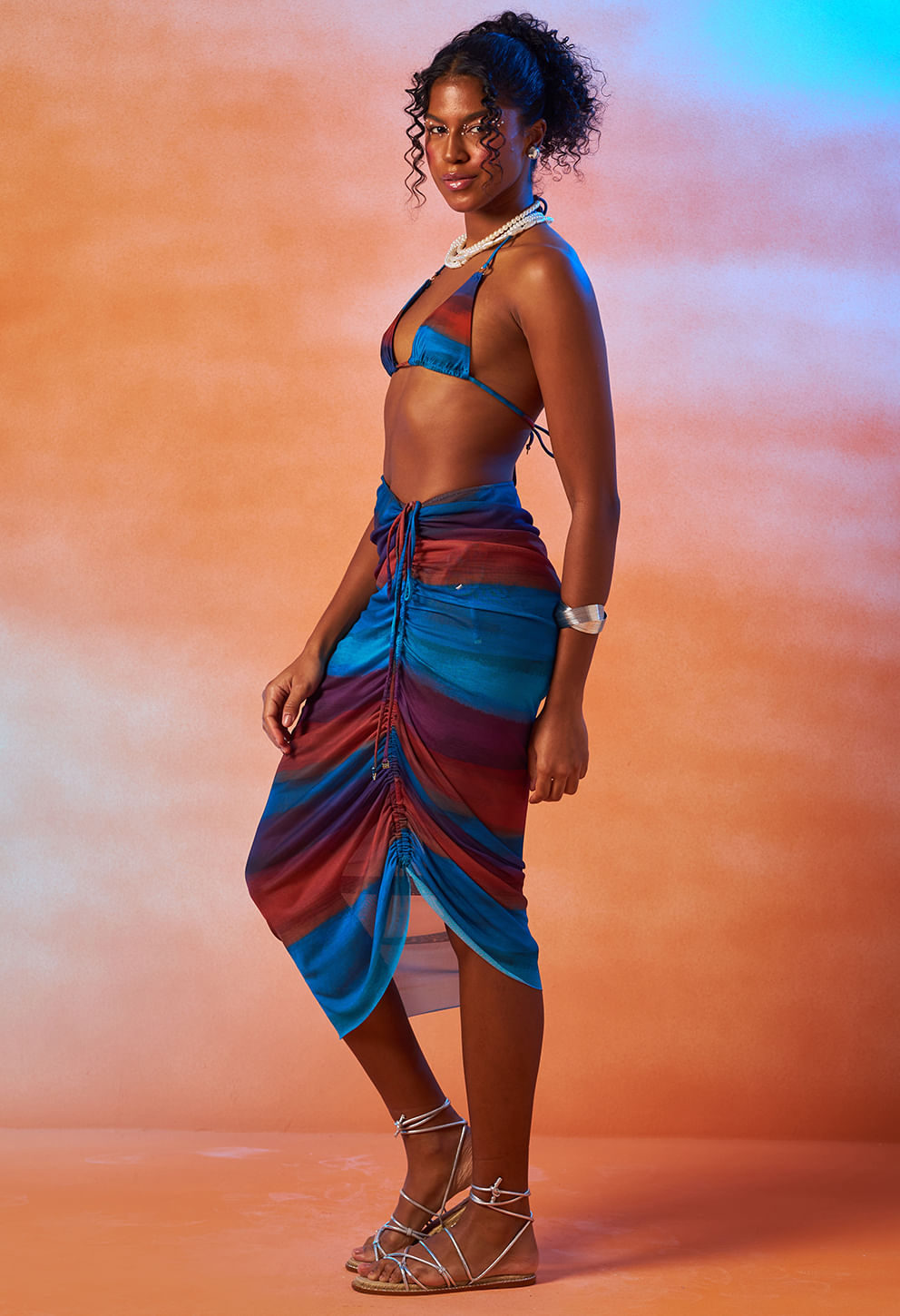 +Saia longa em tule com design drapeado e amarração lateral que permite múltiplos estilos — do midi ao mini ou como vestido tomara que caia. Peça leve,