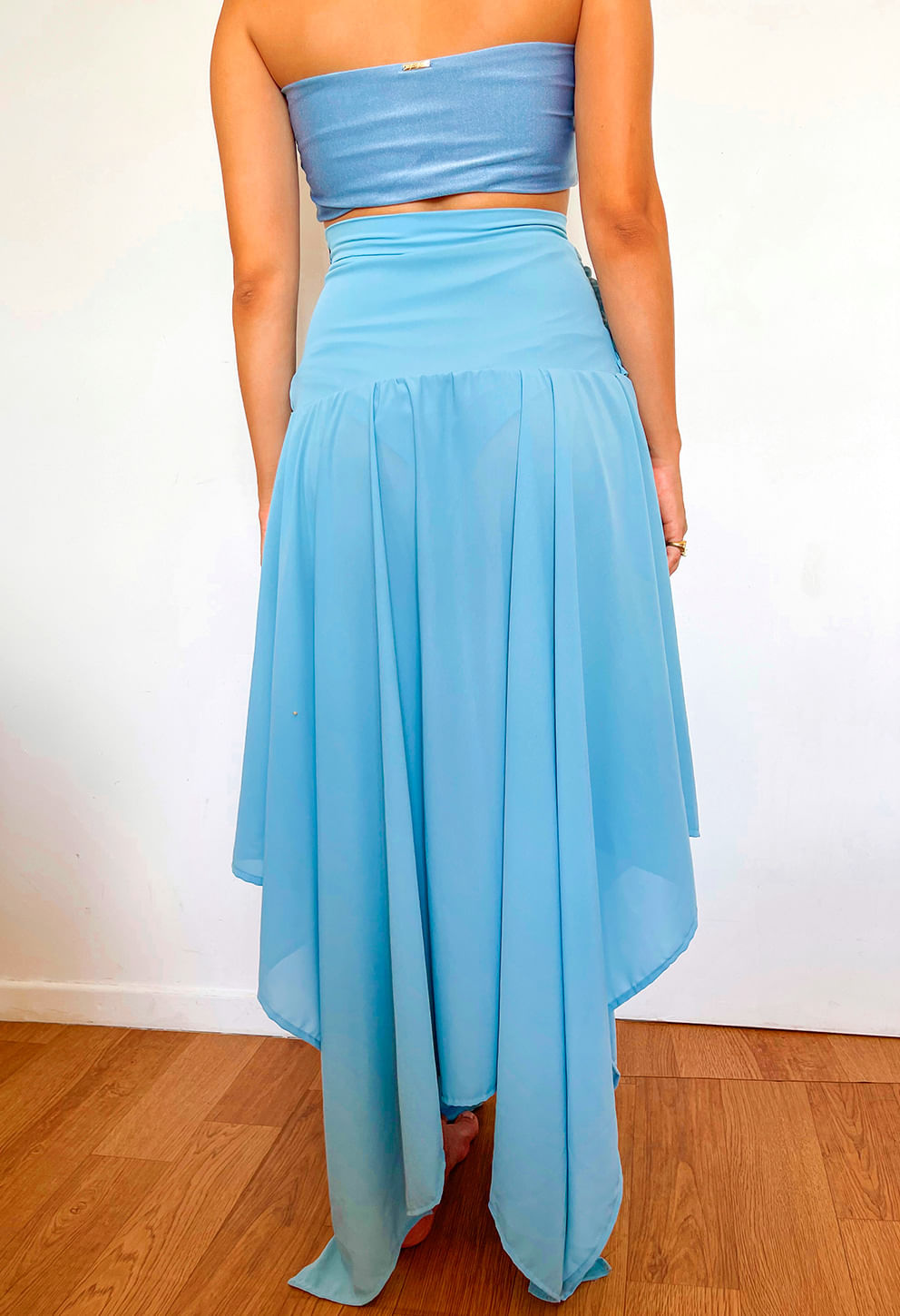 +Saia midi em azul claro com laço frontal e caimento fluido, ideal para looks casuais e elegantes. Peça versátil e exclusiva da coleção limitada FFLab.