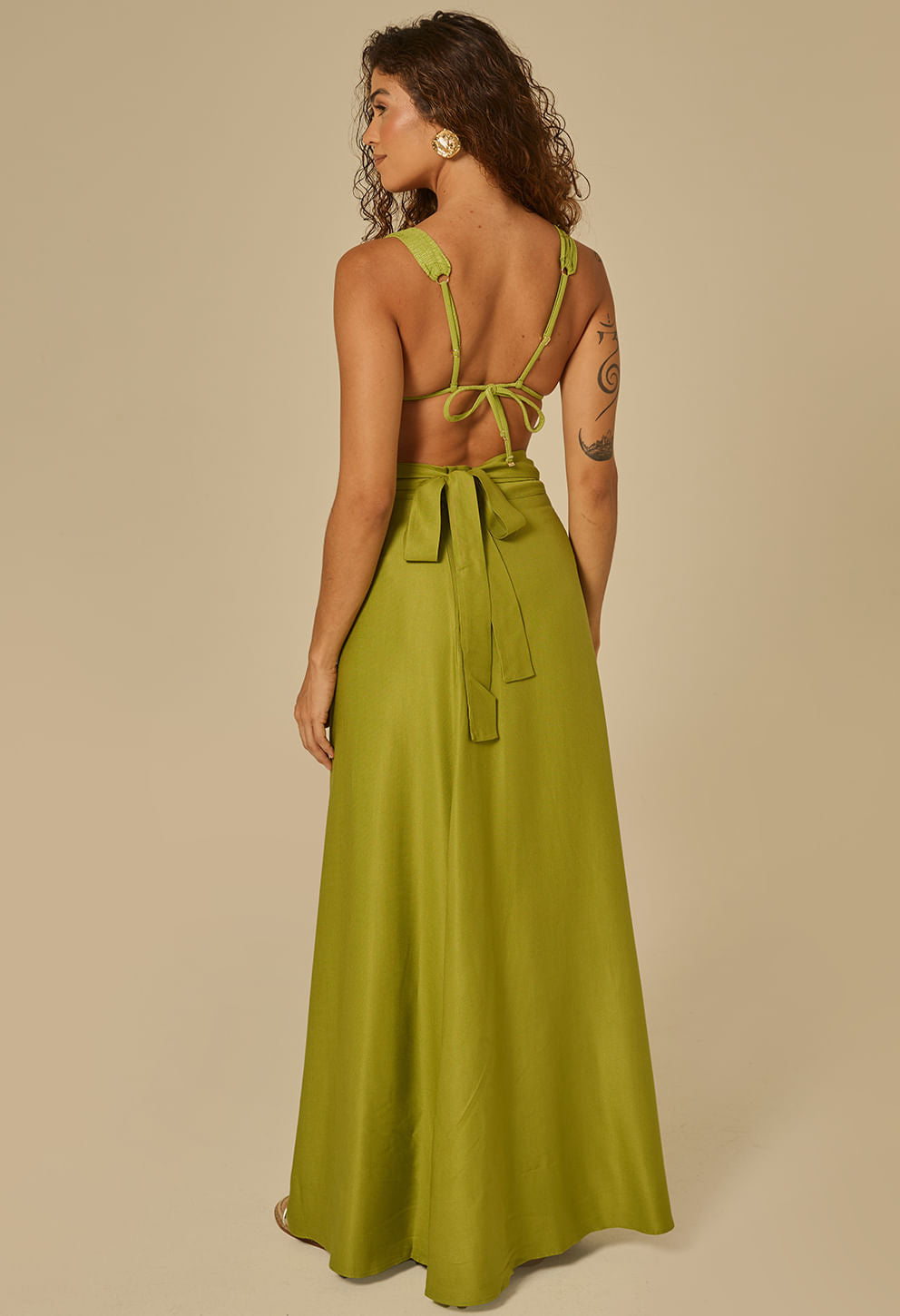 +Saia longa transpassada em tom esmeralda, com tecido leve e amarração na cintura que valoriza a silhueta. Ideal para combinar conforto e elegância em