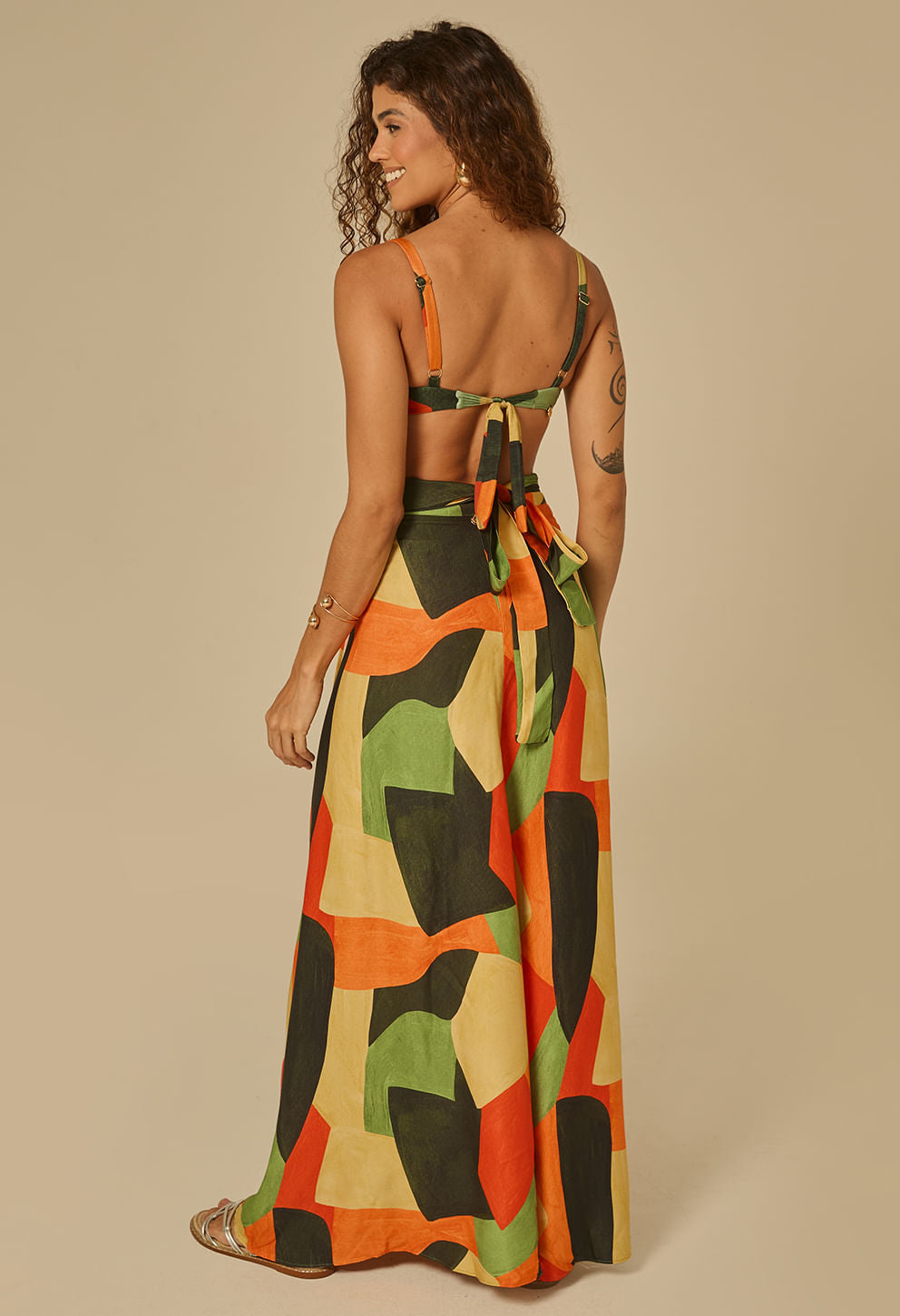 +Saia longa transpassada com amarração na cintura, tecido leve 100% viscose com toque acetinado e estampa geométrica em tons vibrantes, ideal para comp