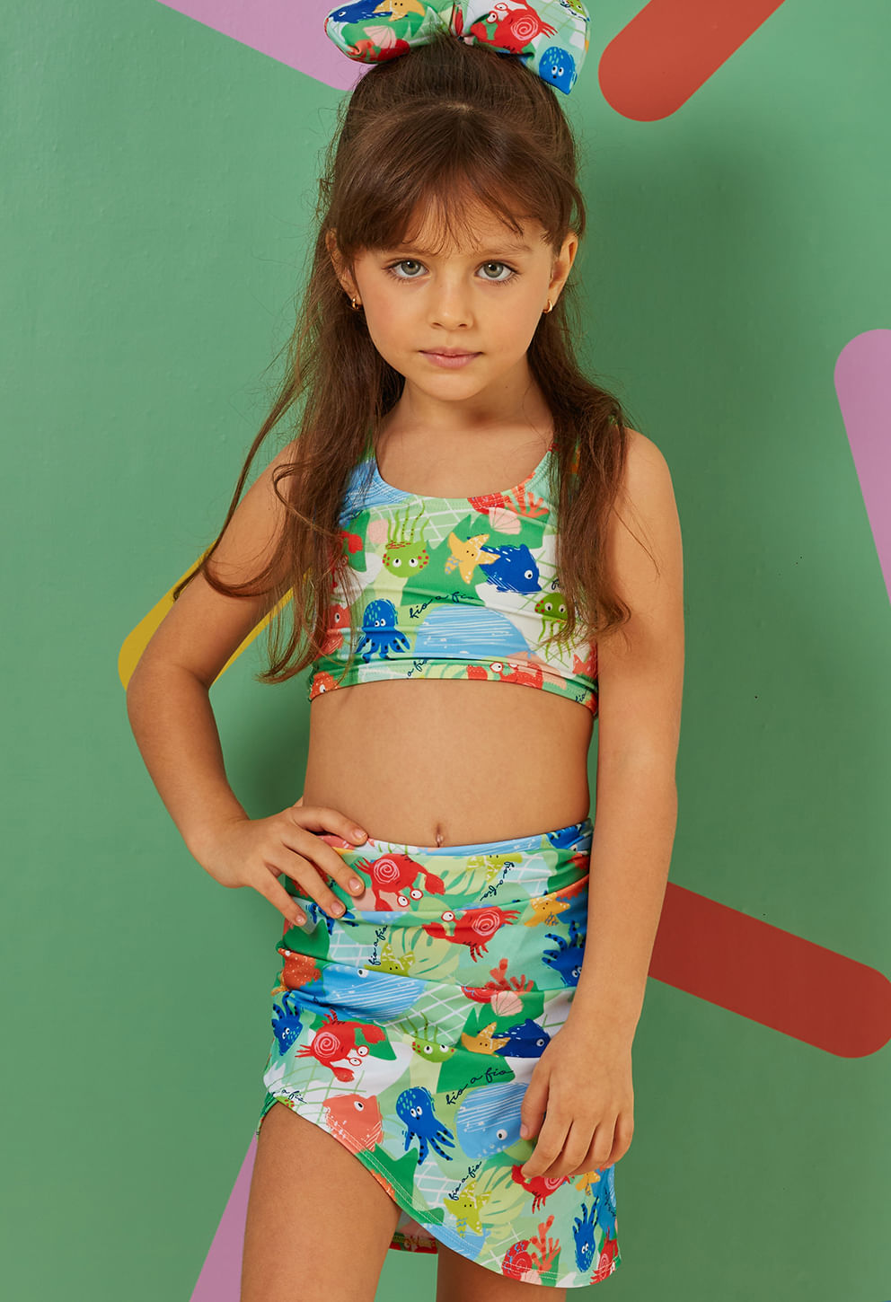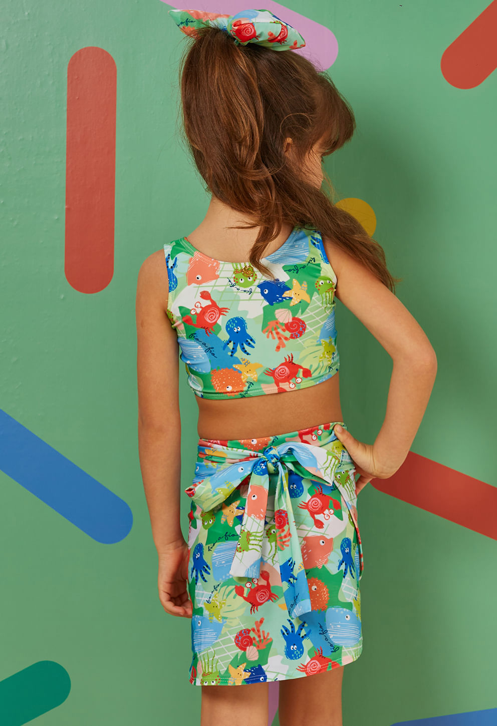 Possui design transpassado, comprimento mini, o cós possui tira de amarração como forma para permitir o transpasse e amarração lateral.
