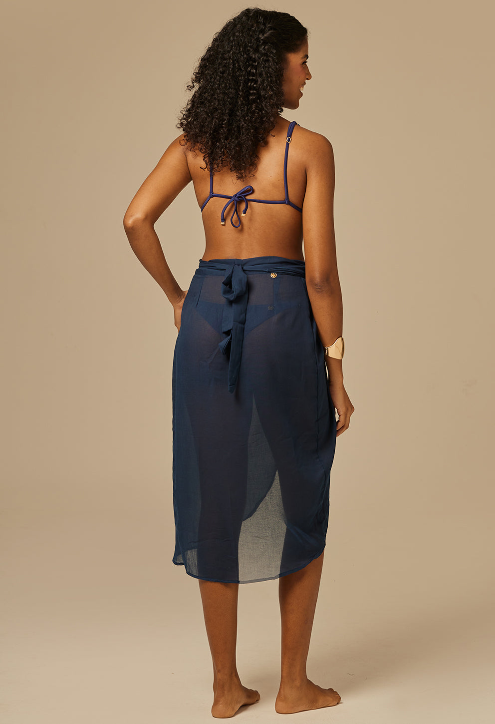 +Saia midi envelope transpassada na cor marinho, com amarração lateral e argola que permite diferentes estilos de uso. Confeccionada em tecido leve e fl