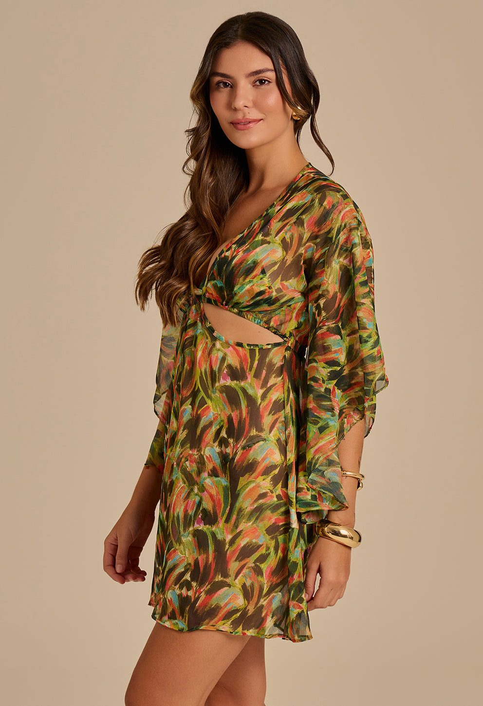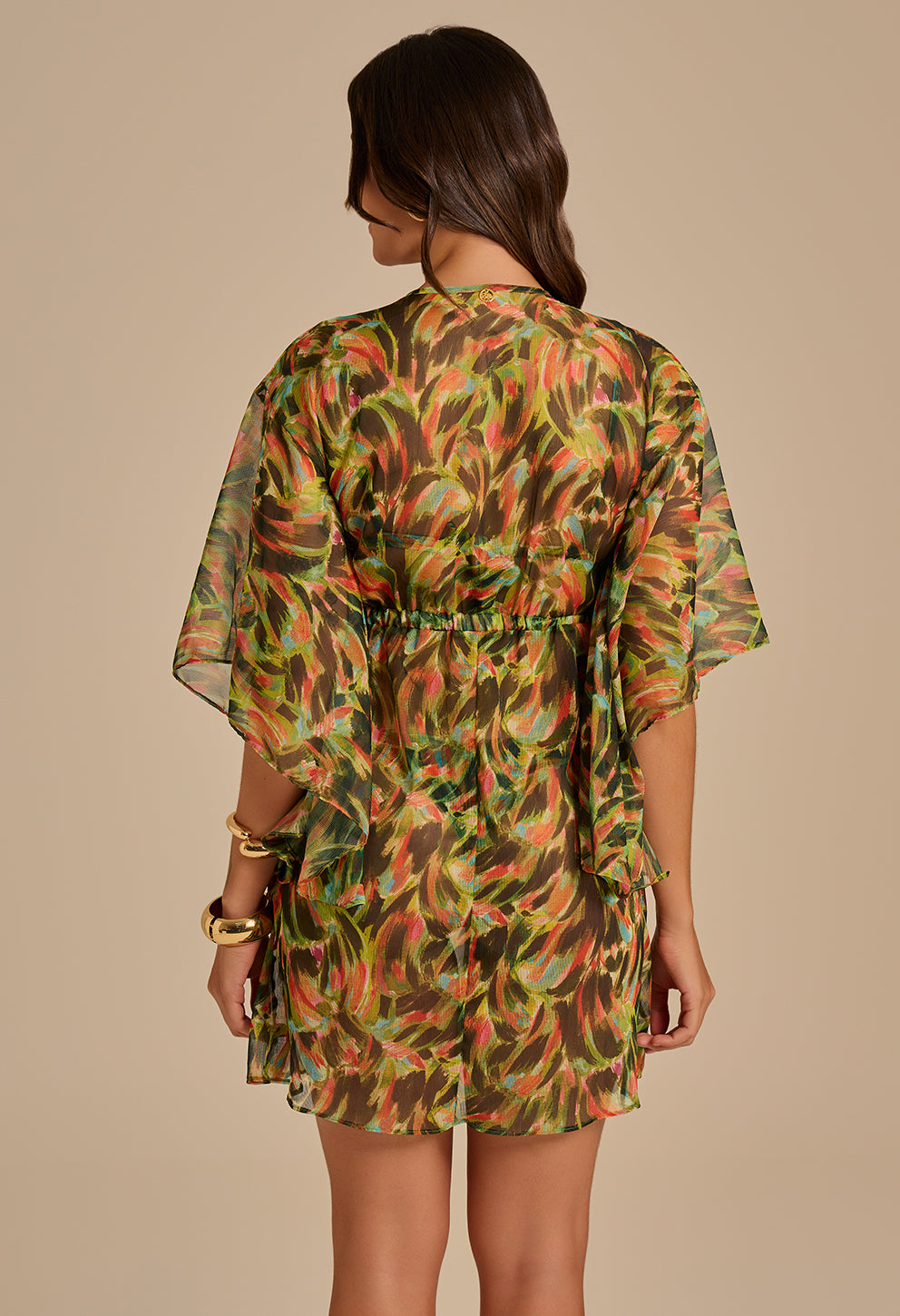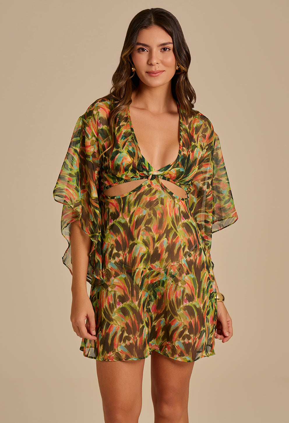 +Com caimento leve e transparente, a Saída Eduarda é curta, possui decote em V, mangas amplas e recortes na cintura que valorizam a silhueta. Ideal para compor looks estilosos nos dias de sol. Todos os detalhes dourados são banhados a ouro.