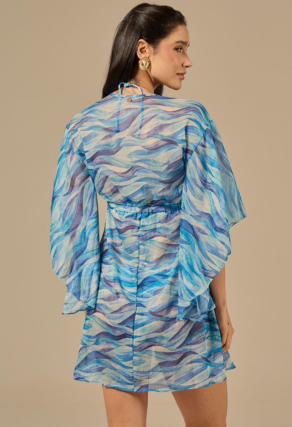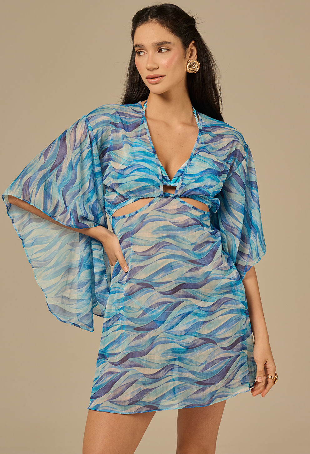 +Saída de praia curta e transparente com caimento leve, mangas amplas e recortes na cintura que valorizam a silhueta; aviamentos dourados com banho em