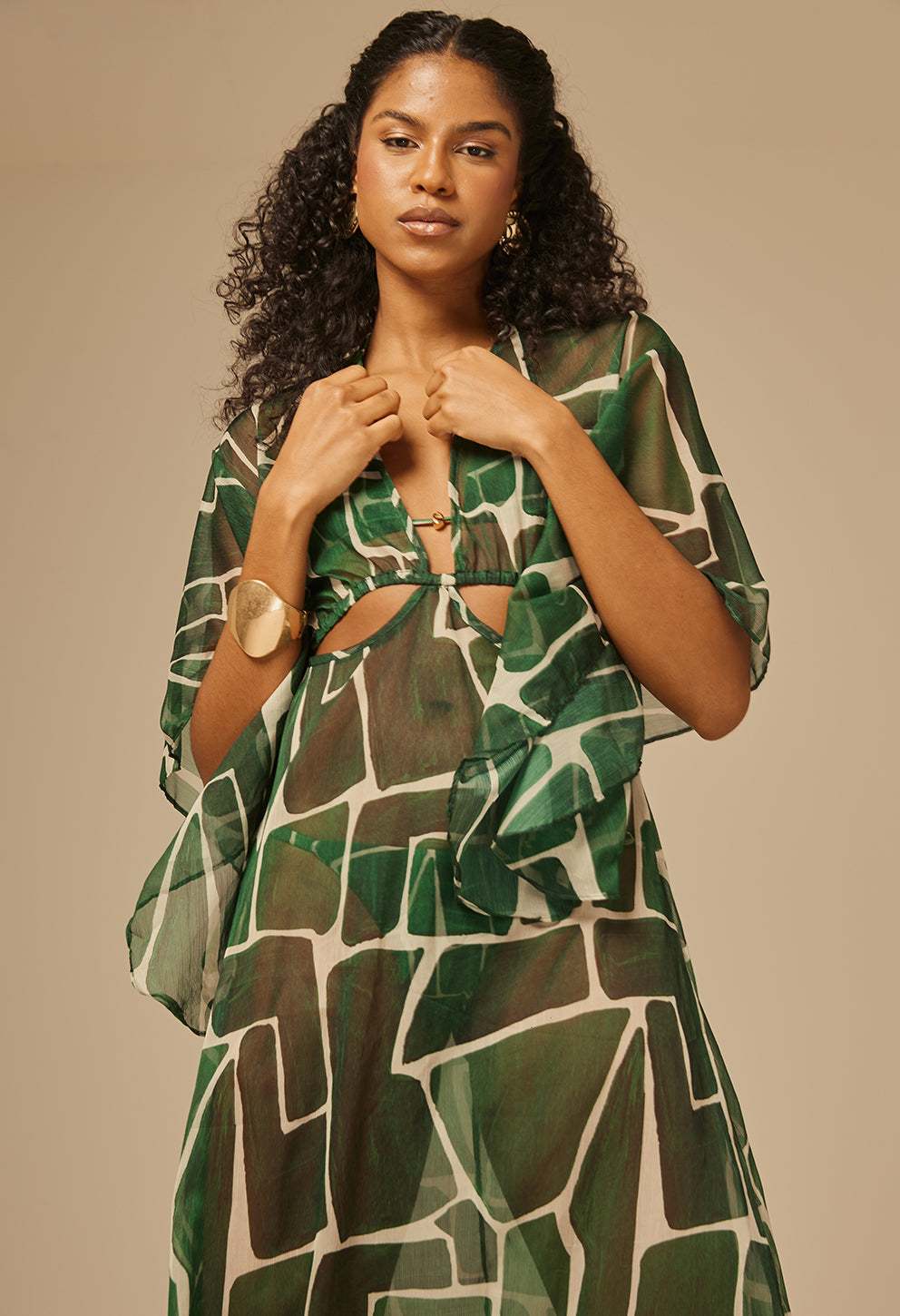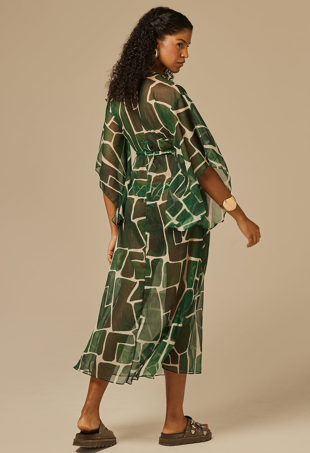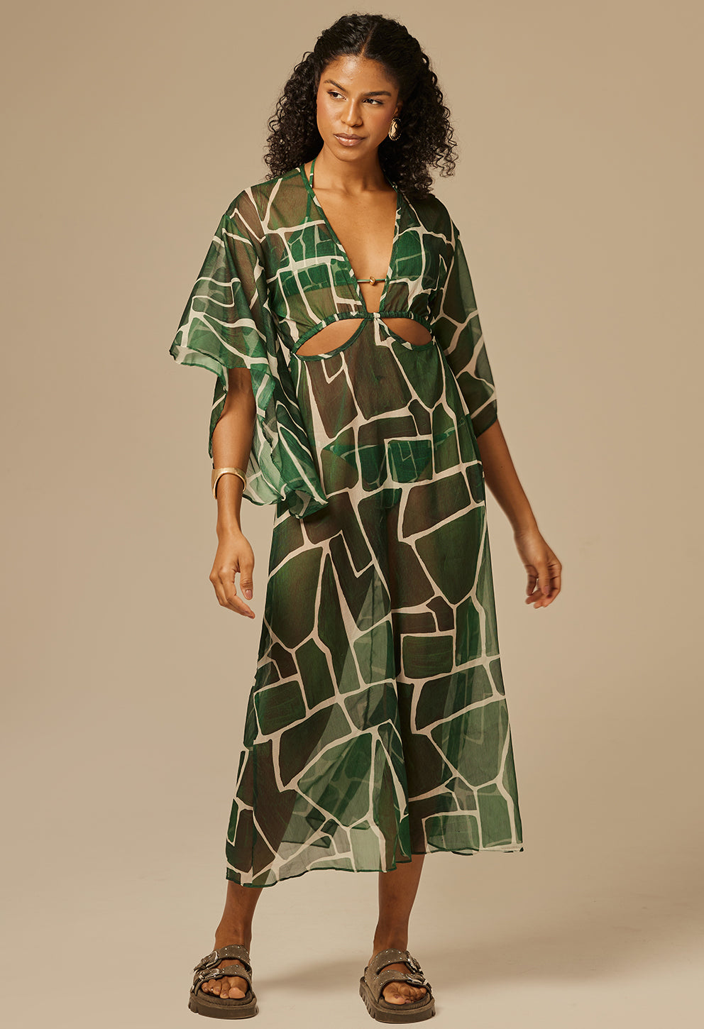 +Saída de praia longa e leve com decote em V, mangas amplas e recortes que valorizam a silhueta, perfeita para dias ensolarados com estilo.