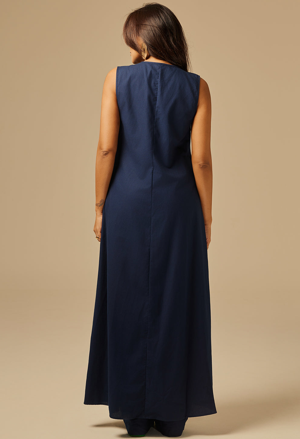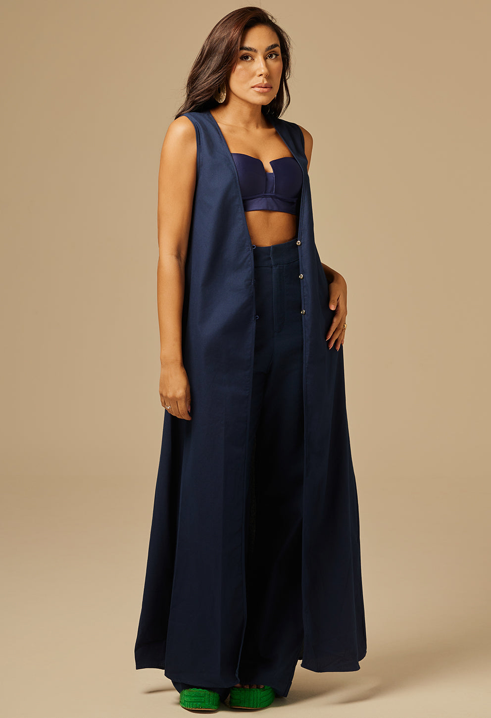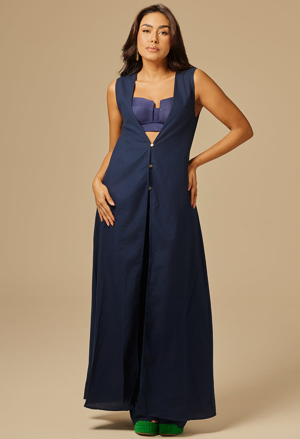 +A Saída Jes PNA Marinho oferece elegância e praticidade com sua modelagem longa e fluida. Confeccionada em algodão 100%, proporciona conforto e frescr