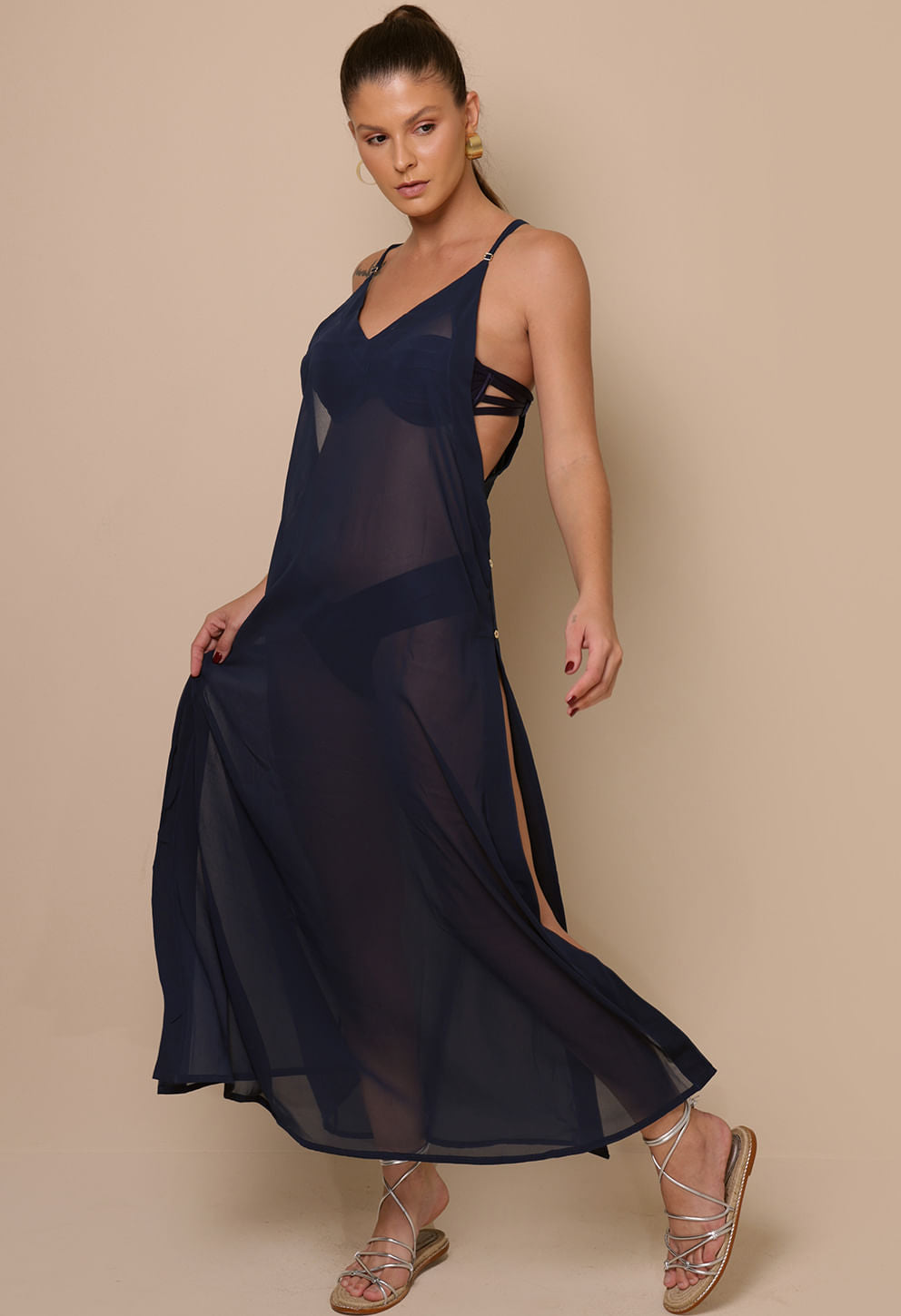 Caimento leve e sofisticado em poliéster, perfeito para usar sobre biquíni com transparência elegante e movimento ao sé
