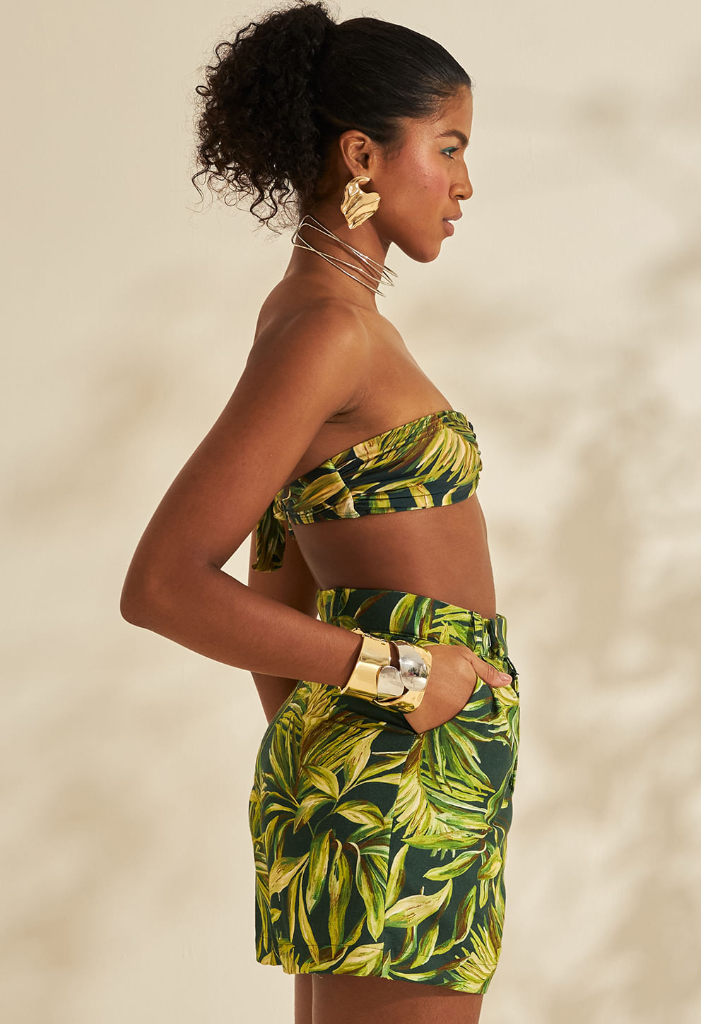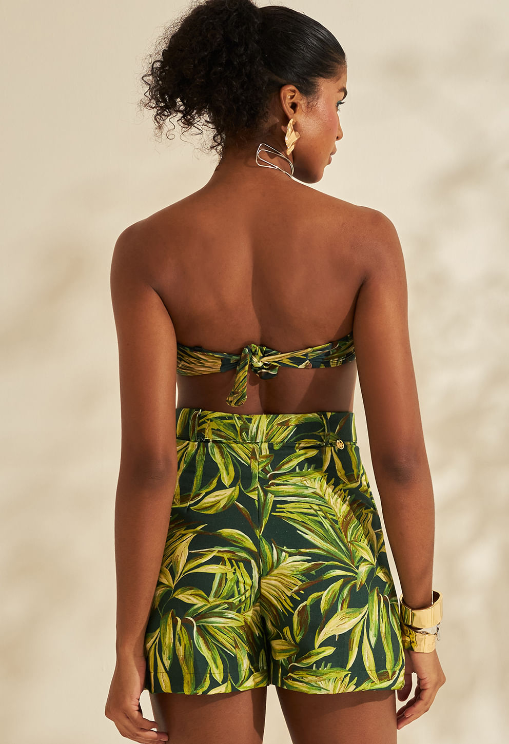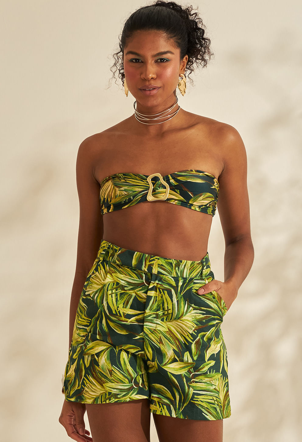 +Short cintura alta com estilo alfaiataria, bolsos laterais e transpasse frontal. Estampa botânica em tons de verde e aviamentos dourados que trazem um
