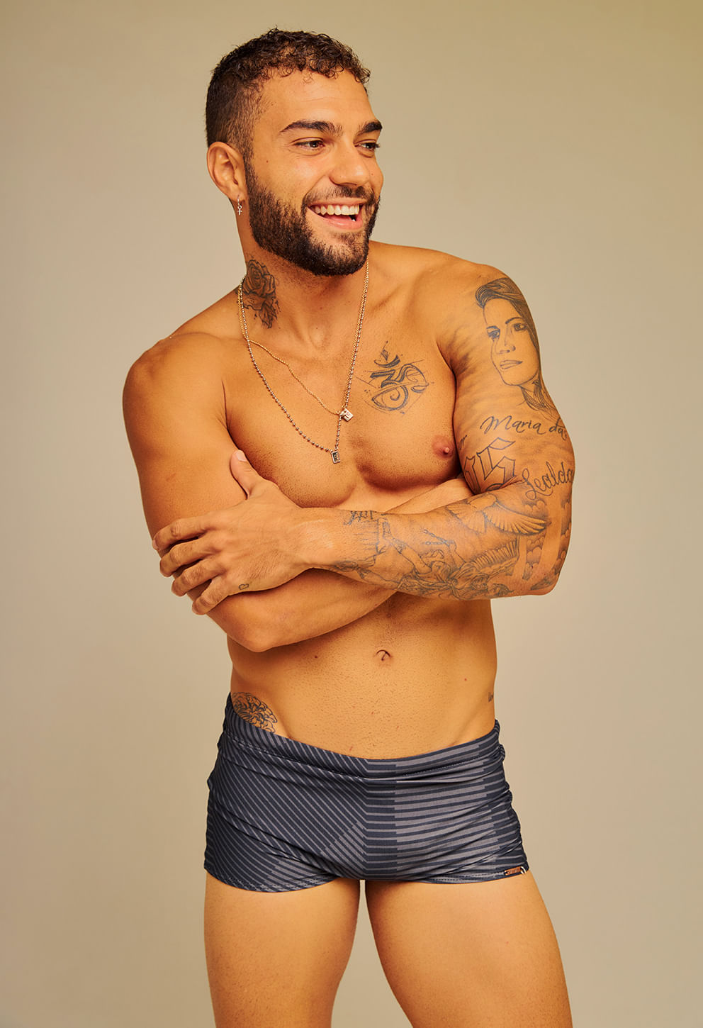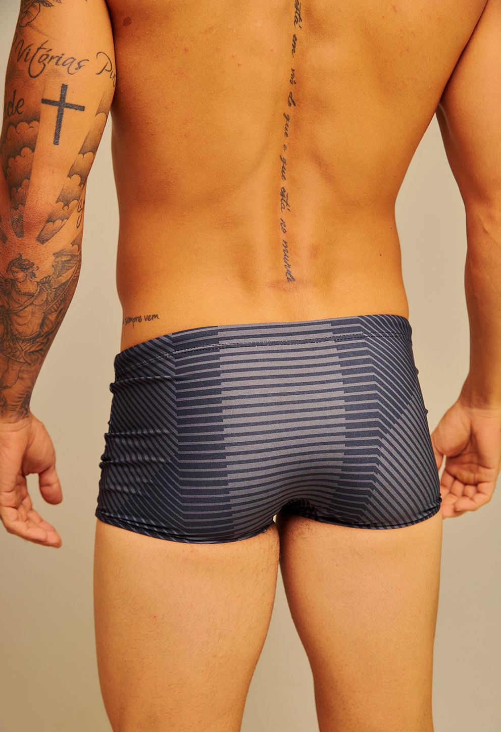 +Sunga short preta com estampa geométrica cinza, modelagem ajustada e cós reforçado para maior conforto. Ideal para quem busca estilo moderno e mobilid
