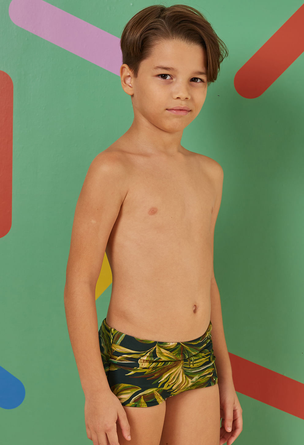 +Sunga short infantil com estampa botânica, ajuste por cadarço e modelagem confortável — ideal para brincar na praia ou piscina com proteção UV.