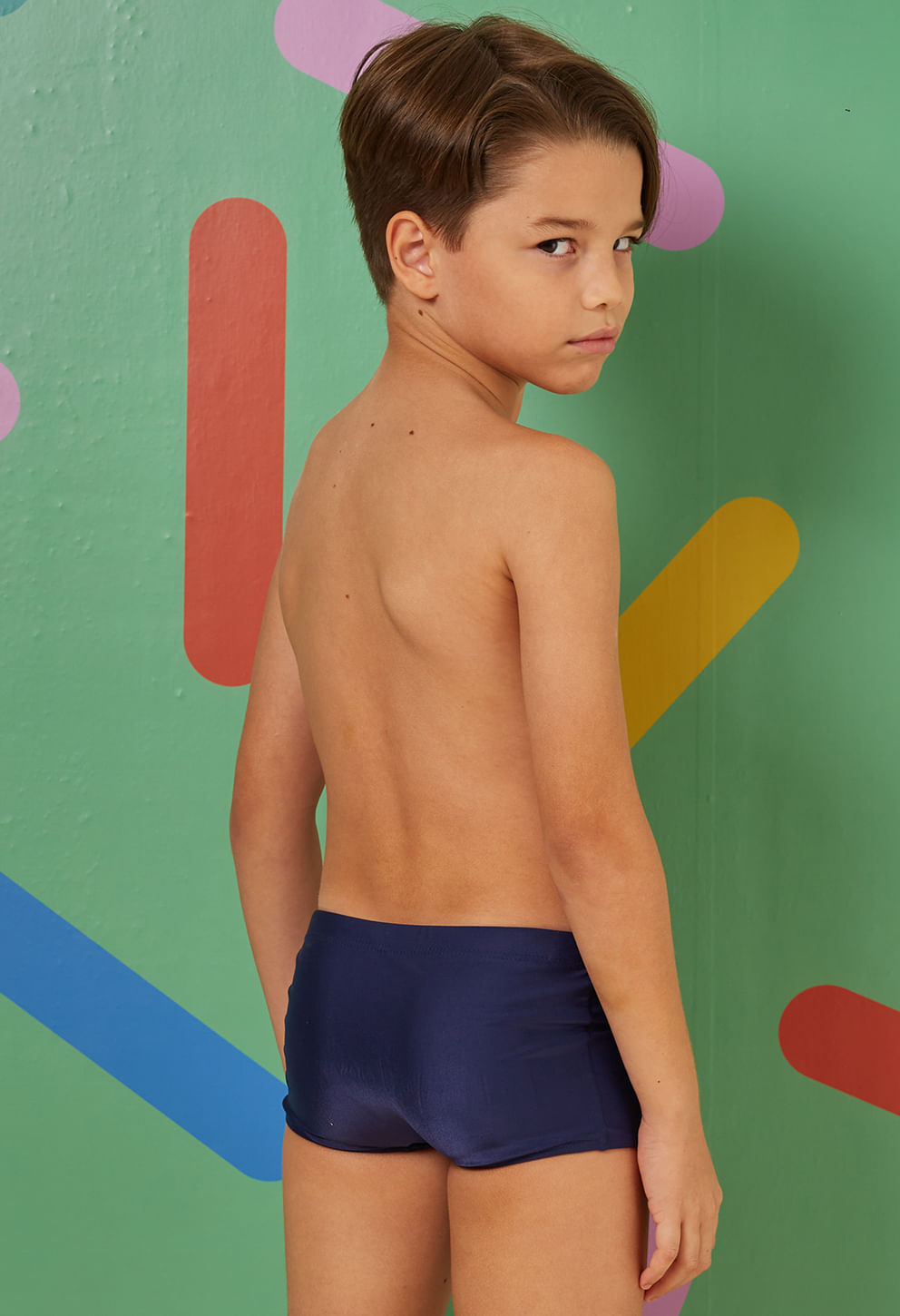+Sunga short infantil em marinho, confortável e resistente, ideal para brincadeiras na praia. Tecido com proteção UV e elasticidade para liberdade de o