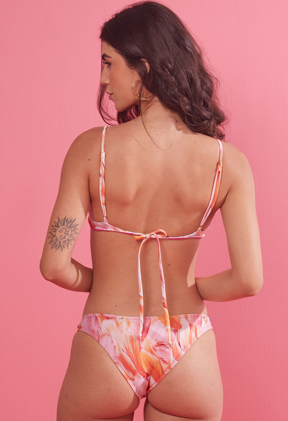 +Top cortininha com argola dourada, bojo removível, alça regulável e amarração nas costas para conforto e estilo à beira-mar.