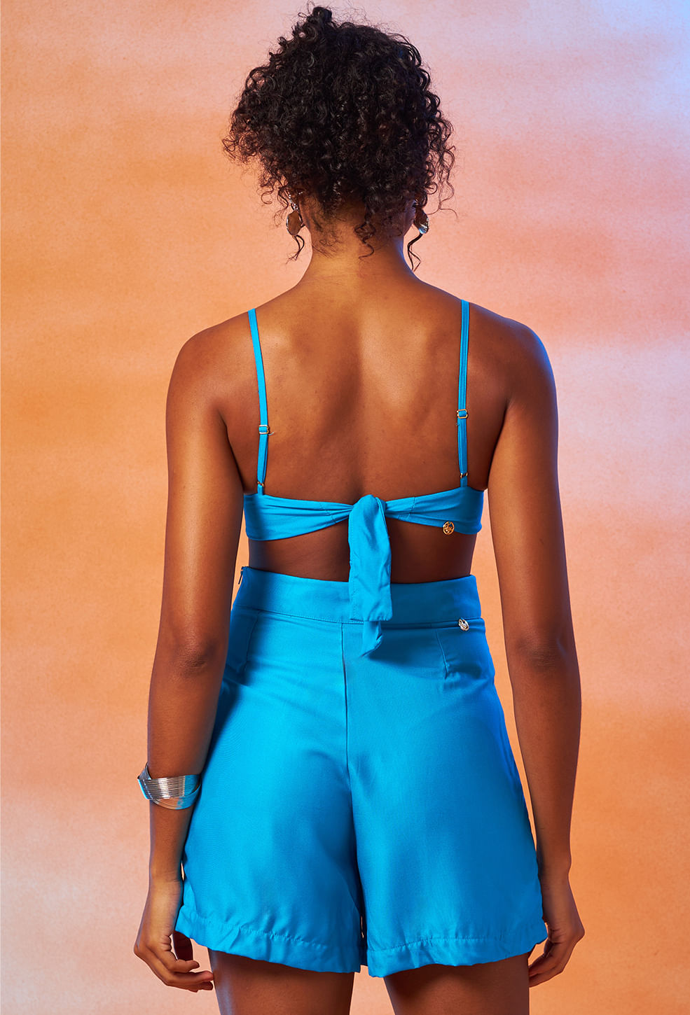 +Top cortininha Azul Vibrante com pala sob o busto, alças reguláveis e amarração nas costas. Peça versátil e leve, ideal para compor looks de moda prá