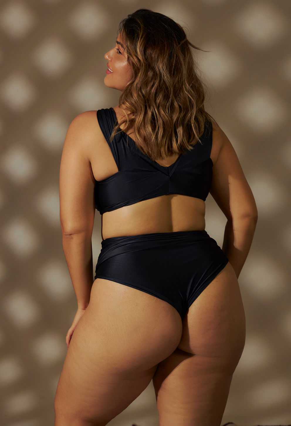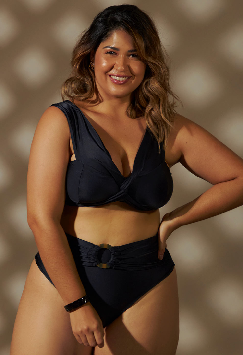 Nó frontal e alças drapeadas que modelam e proporcionam ajuste seguro, realçando o decote com conforto para o dia a dia.