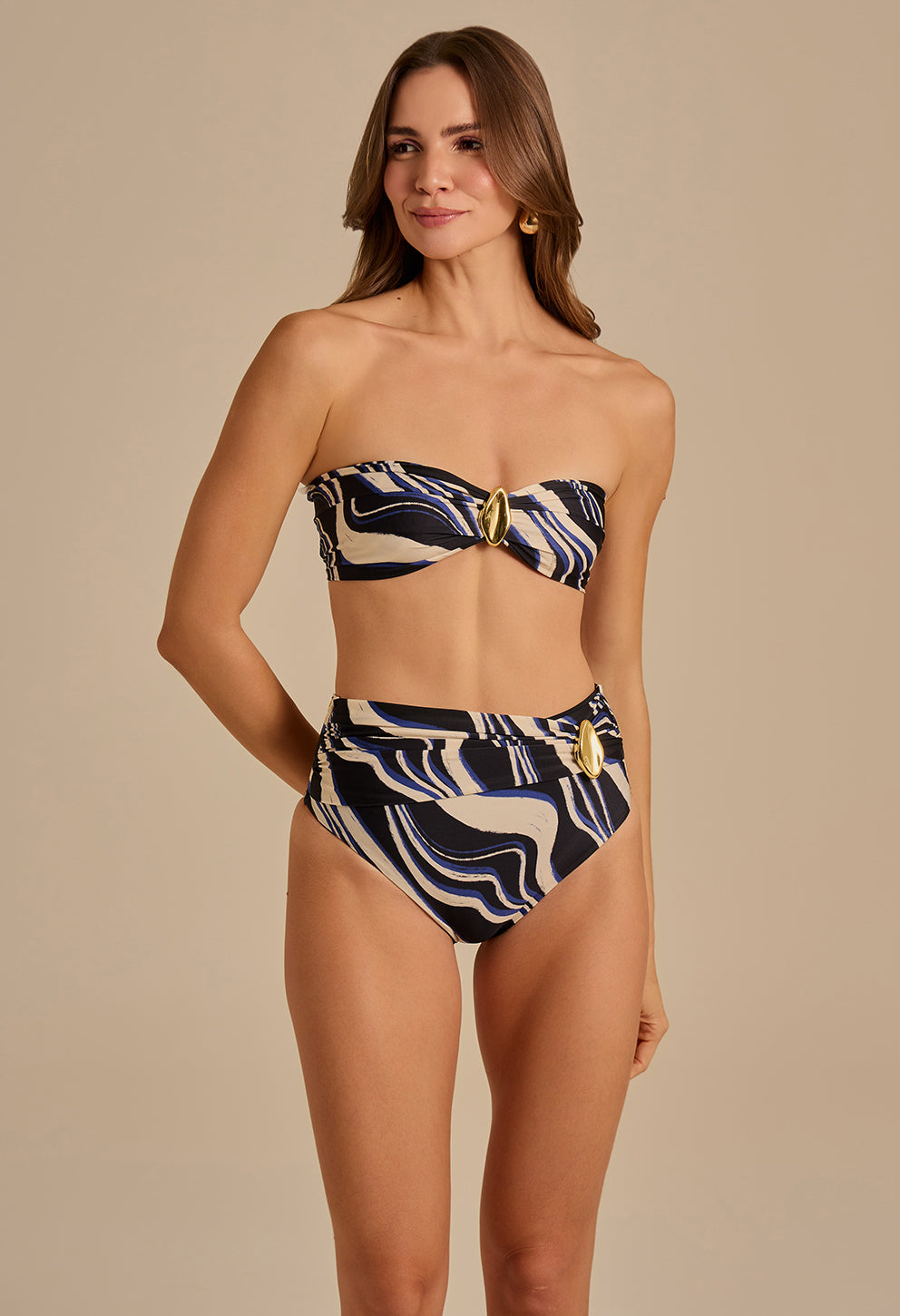 +O Top Noeli Com Aviamento é uma peça sofisticada de moda praia desenhada para oferecer sustentação e um design exclusivo, unindo a funcionalidade de um halter neck com a elegância de um busto estruturado em faixa. A modelagem é caracterizada pela amarração ajustável no pescoço, permitindo que a usuária regule o caimento para o máximo conforto e um decote valorizado. No centro do busto, um aviamento dourado em formato orgânico cria um elegante detalhe franzido, transformando o clássico top faixa em uma peça de alto design com um toque beachwear luxuoso. Sua usabilidade é otimizada pela faixa traseira ampla e reta, que assegura fixação e segurança, tornando o top ideal não só para banho, mas também para compor looks de verão mais elaborados. Todos os detalhes dourados são banhados a ouro.