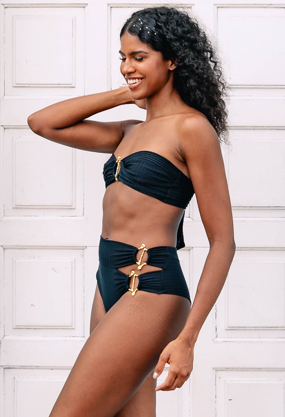 +Top tomara que caia com fivela martelada frontal e textura canelada. Conforto e sustentação com tecido microfibra, perfeito para looks de moda praia e