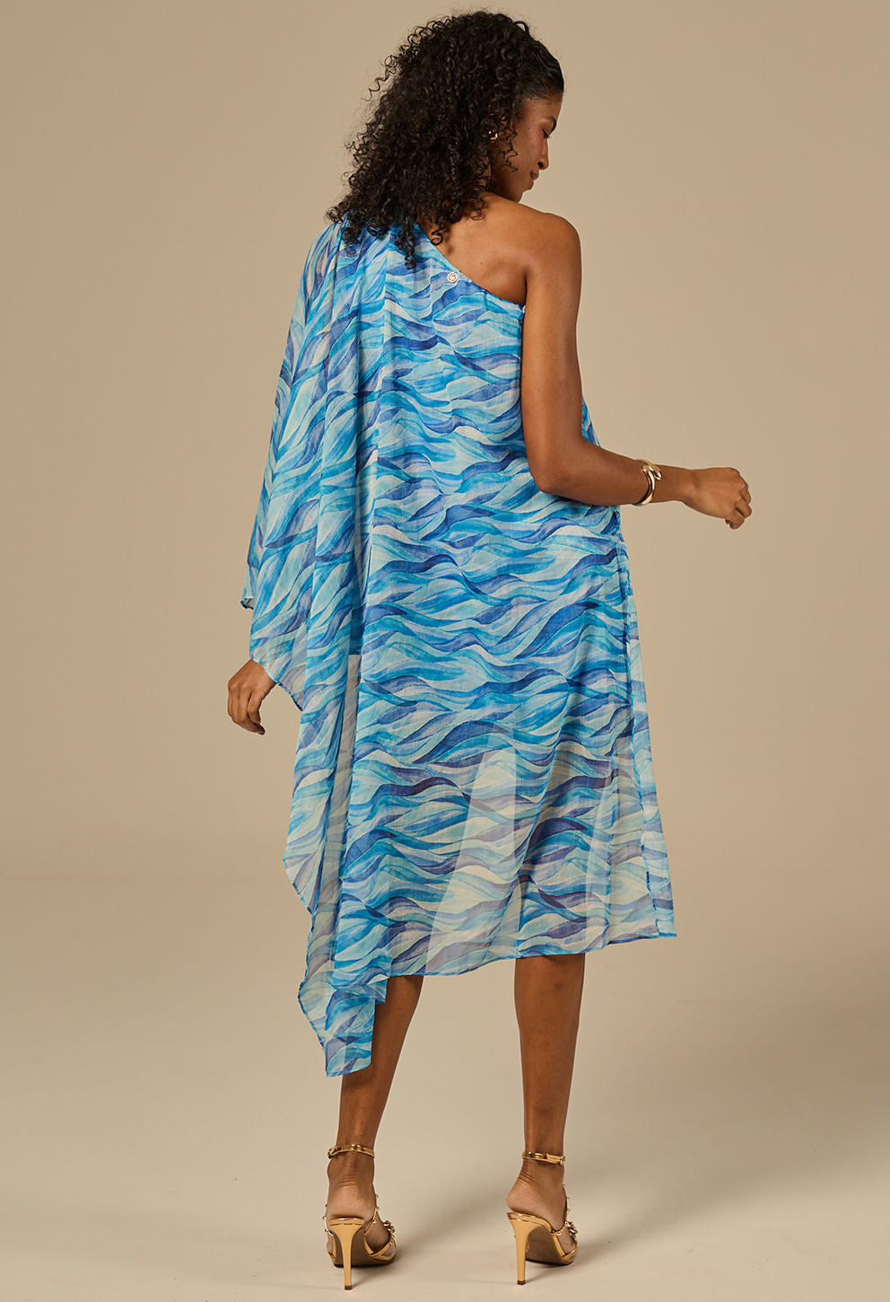 +Vestido curto assimétrico com ombro único e caimento fluido em poliéster; elegante e confortável para ocasiões especiais.