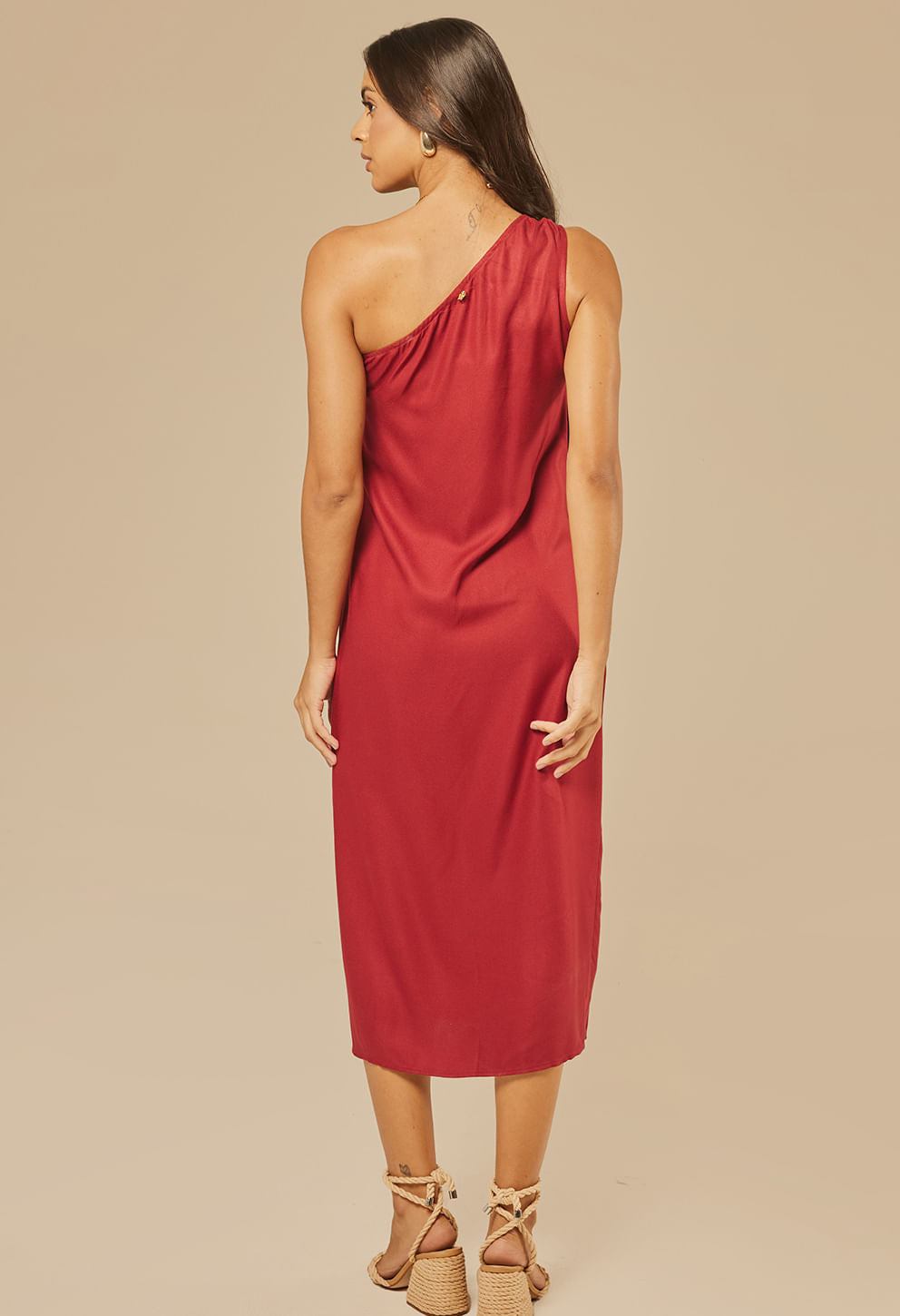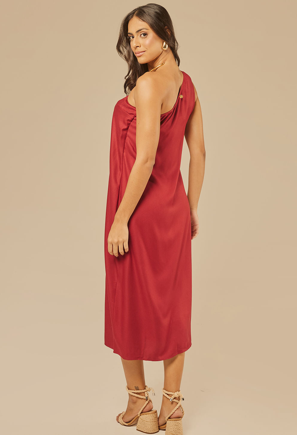 +Vestido midi ombro único com drapeado e enfeite dourado, em tecido de viscose fluido. Versátil e sofisticado, perfeito do dia à noite para quem busca