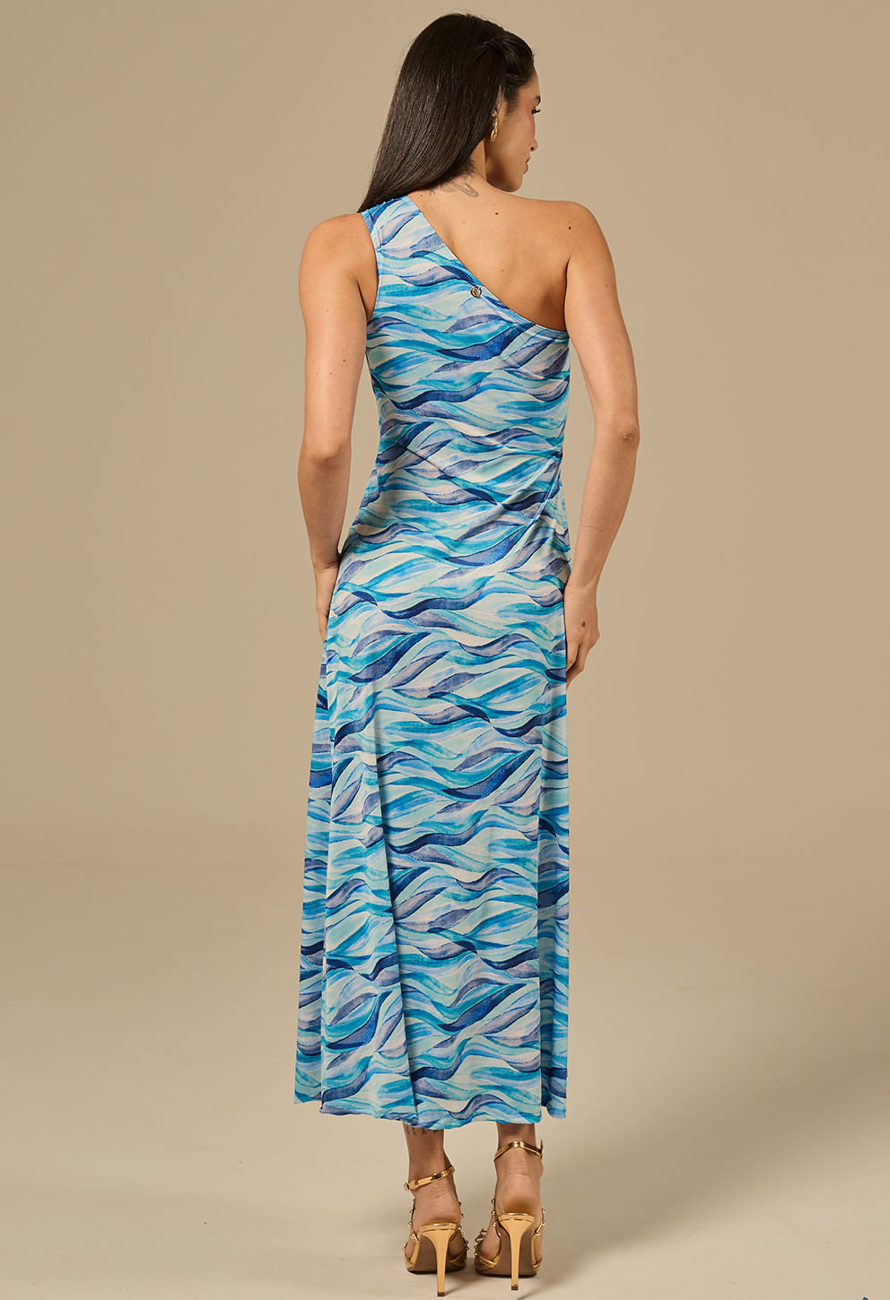 Um ombro só e fenda frontal que valorizam a silhueta.