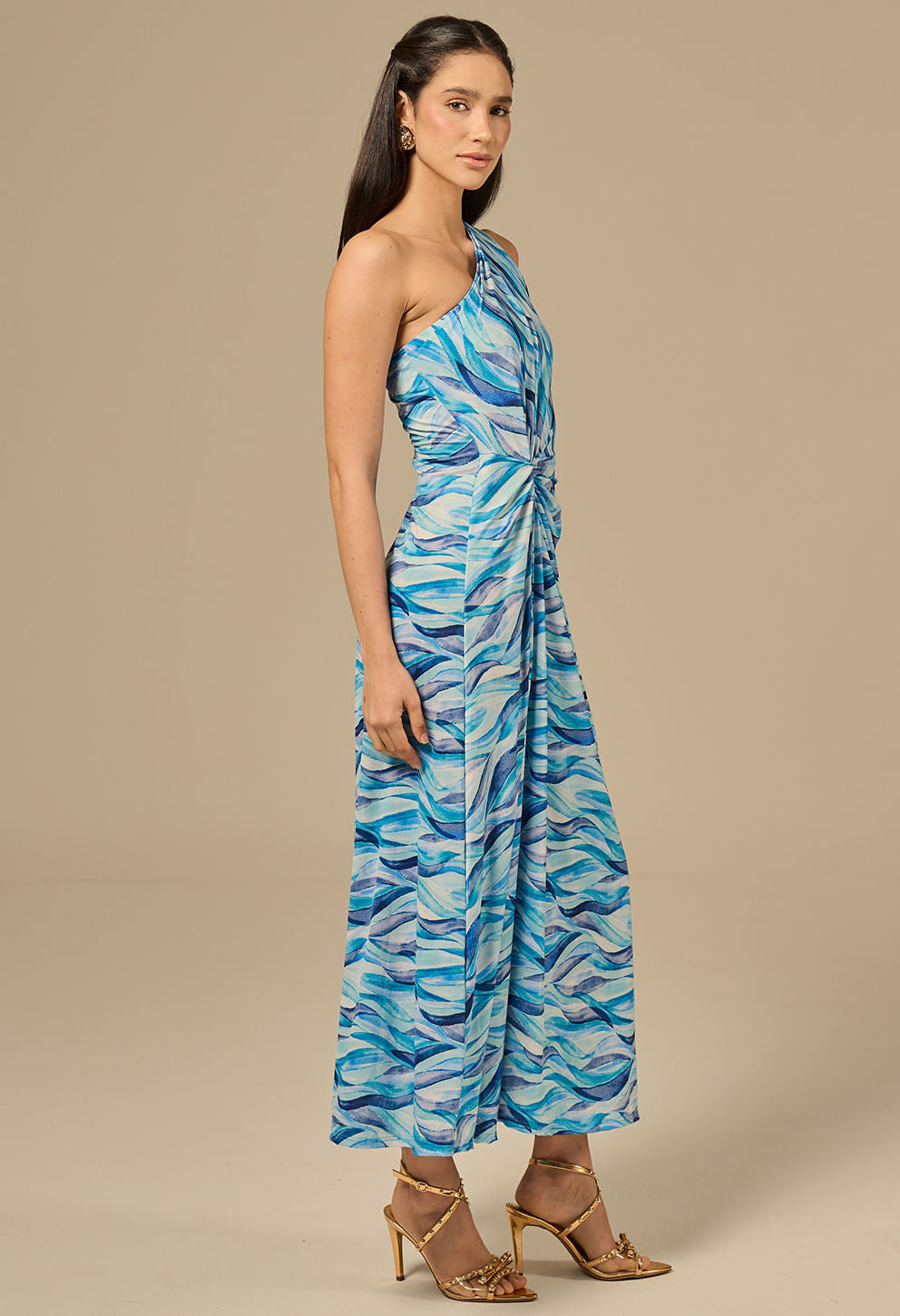 Microfibra fluida que valoriza a silhueta; detalhe drapeado e aviamentos banhados a ouro.