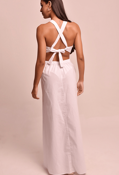 +Vestido longo branco em viscose com recorte princesa, cut out lateral e amarração nas costas. Leve, sofisticado e ideal para transitar da praia ao uso
