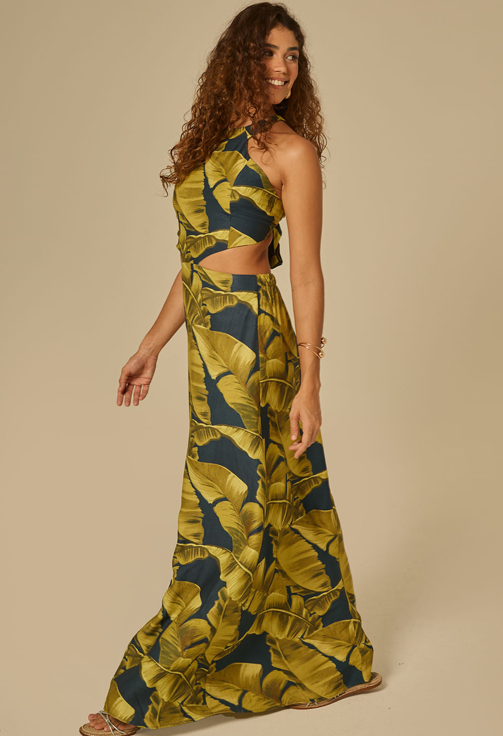 +Vestido longo com recorte princesa, cut out lateral e amarração nas costas. Em viscose acetinada, une conforto e elegância para transitar do beachwear