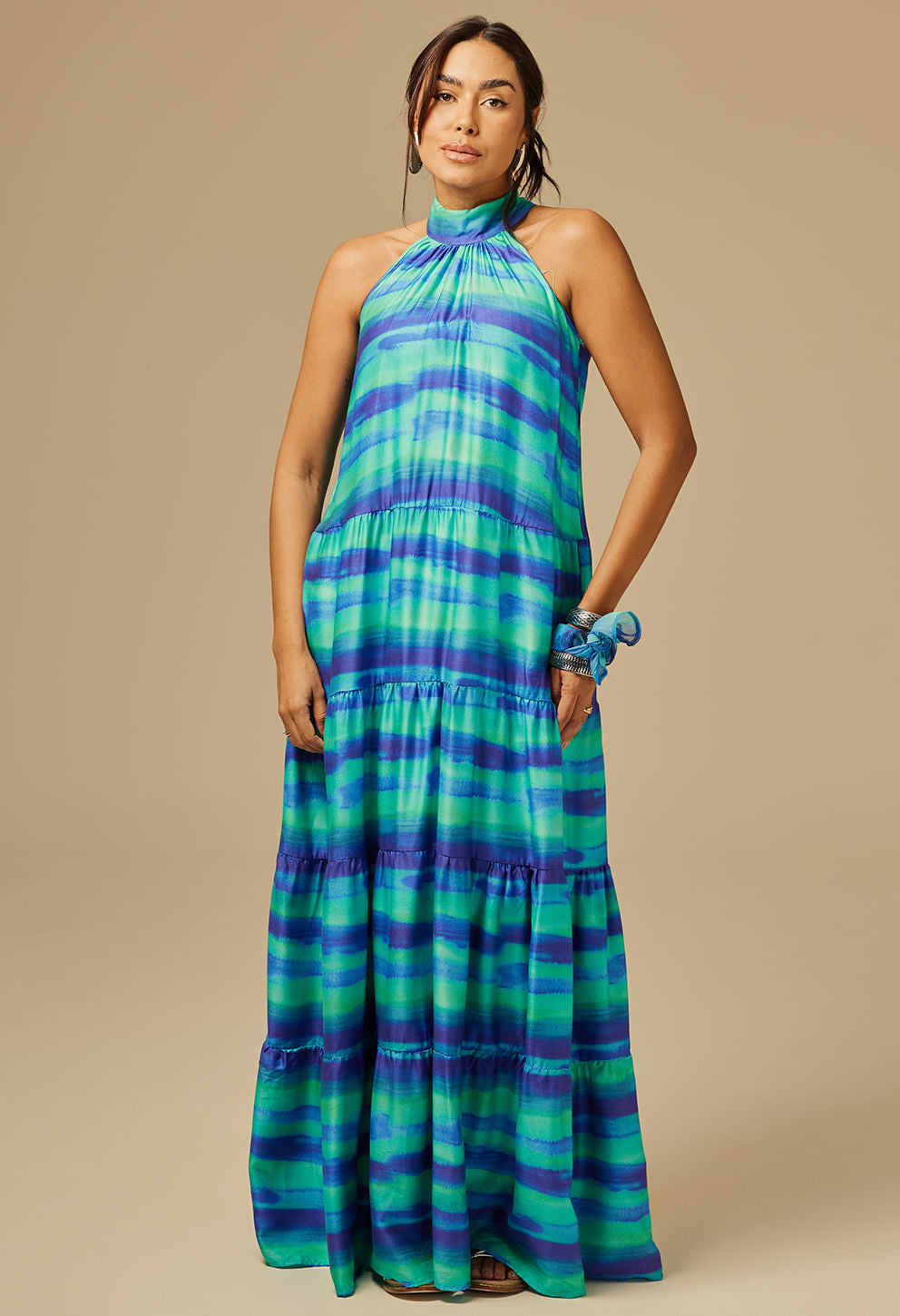+Vestido longo New Jasmin Boreal com modelagem evasê e babados horizontais que proporcionam movimento e elegância. Ideal para ocasiões que pedem estilo