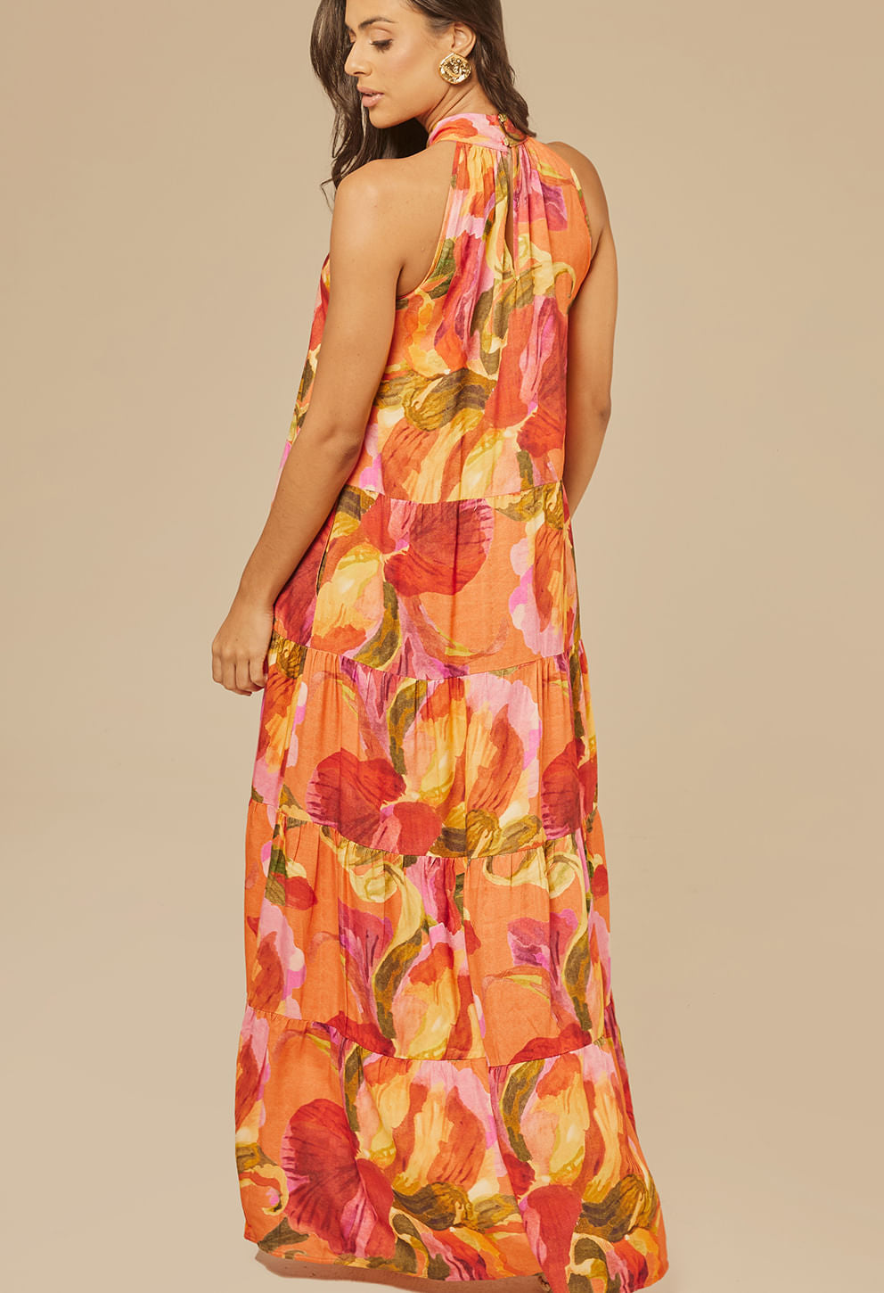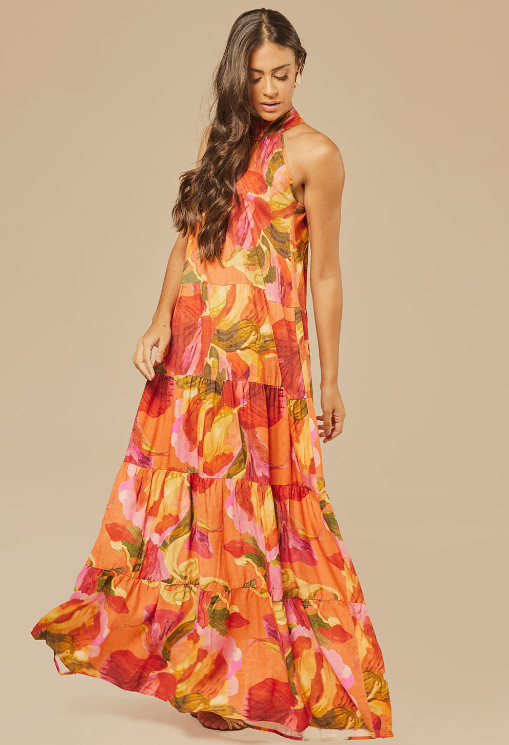 +Vestido longo e fluido com gola halter e camadas franzidas que proporcionam leveza e movimento. Estampa floral vibrante e tecido 100% viscose acetinad