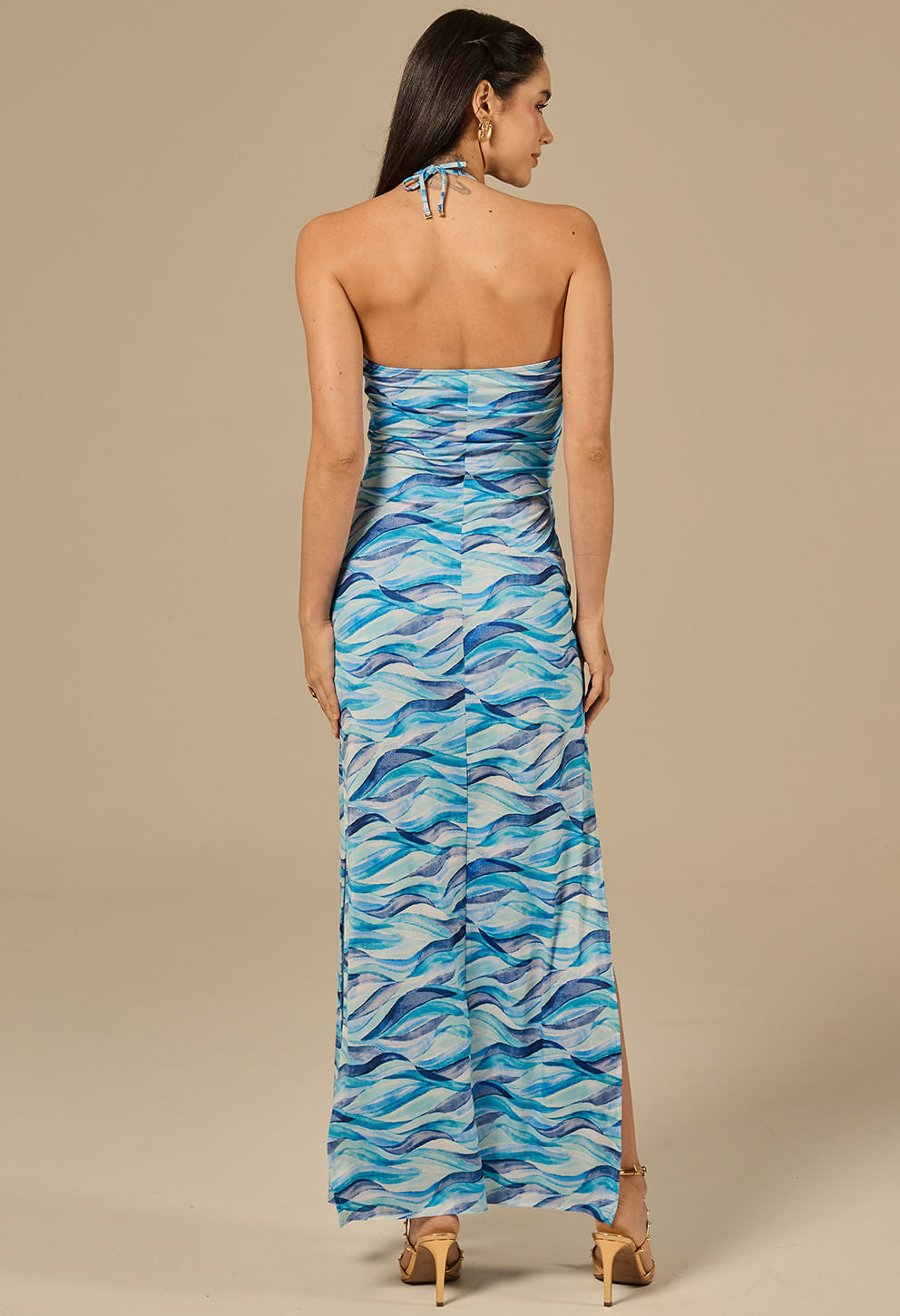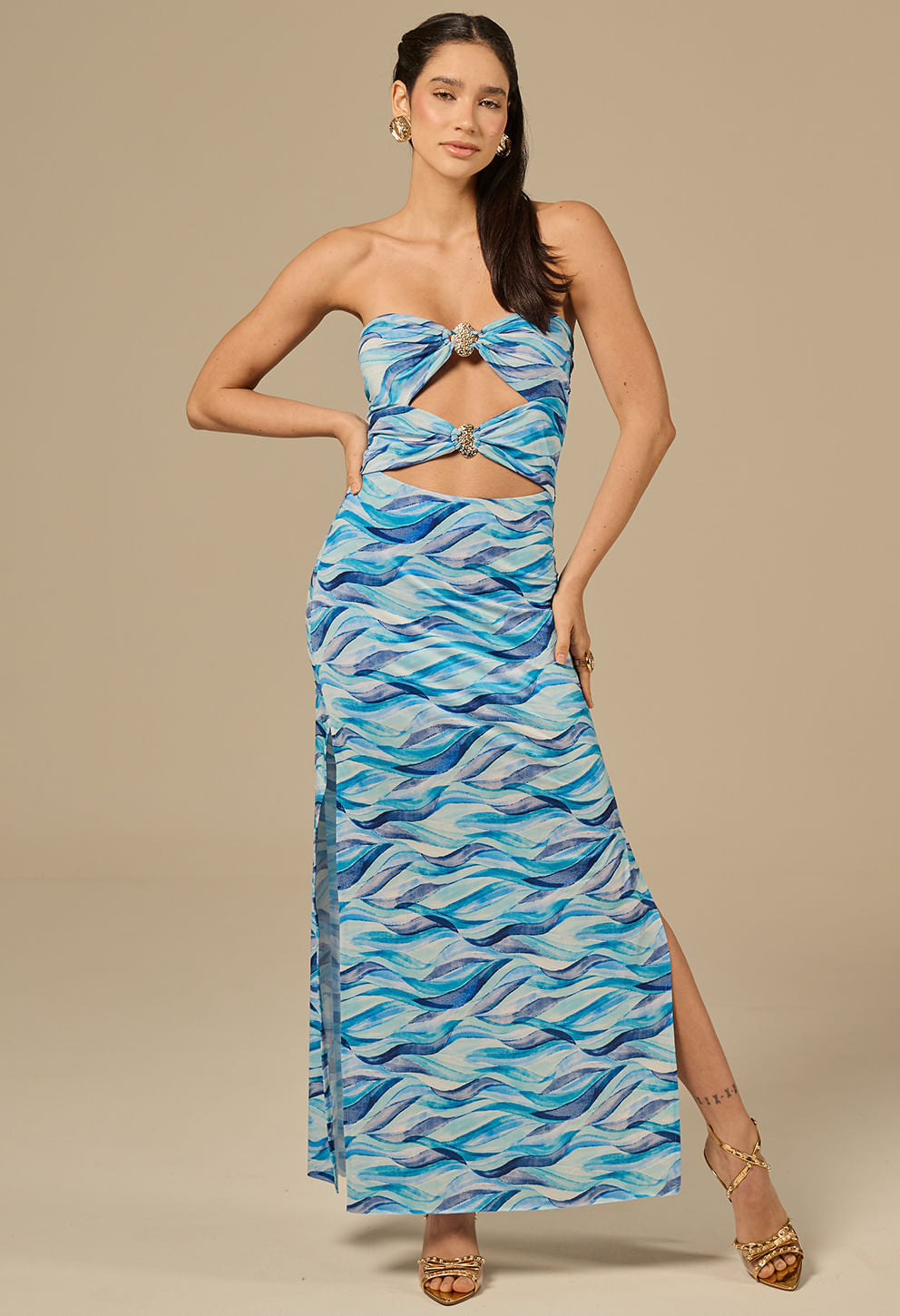 +Vestido longo com estampa abstrata, recortes frontais e argolas douradas que unem conforto e sofisticação. Ideal para ocasiões especiais, com bojo e a