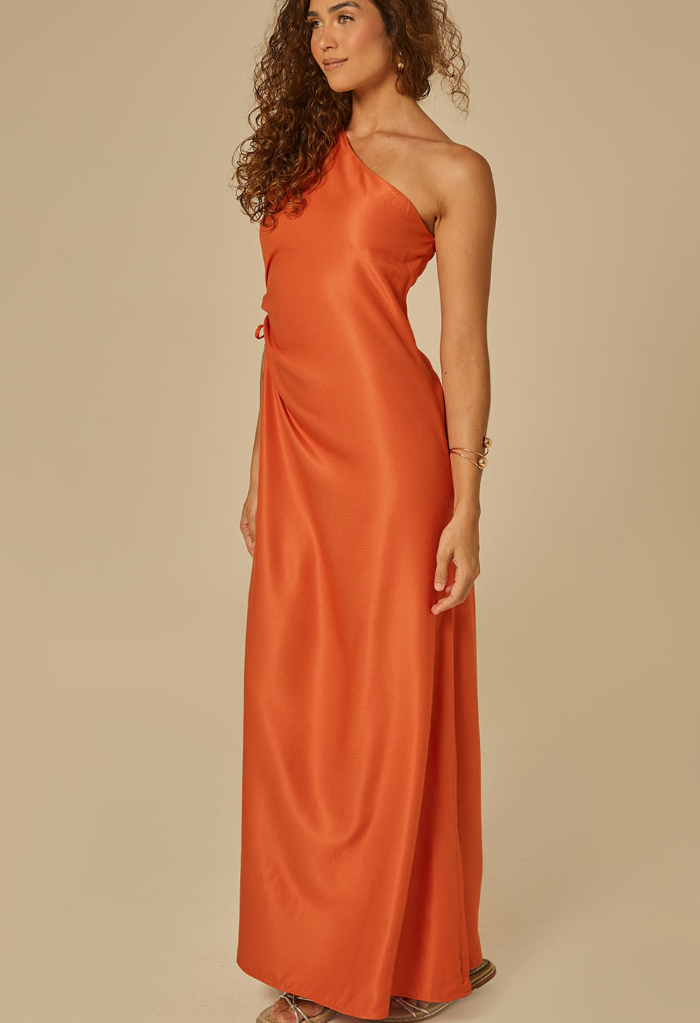 +Vestido longo Norma Sunset em tecido leve e fluido, com design assimétrico de um ombro só e franzido lateral ajustável para melhor caimento e estilo.