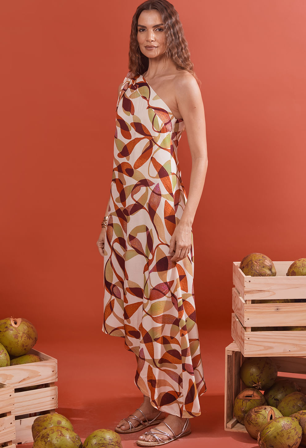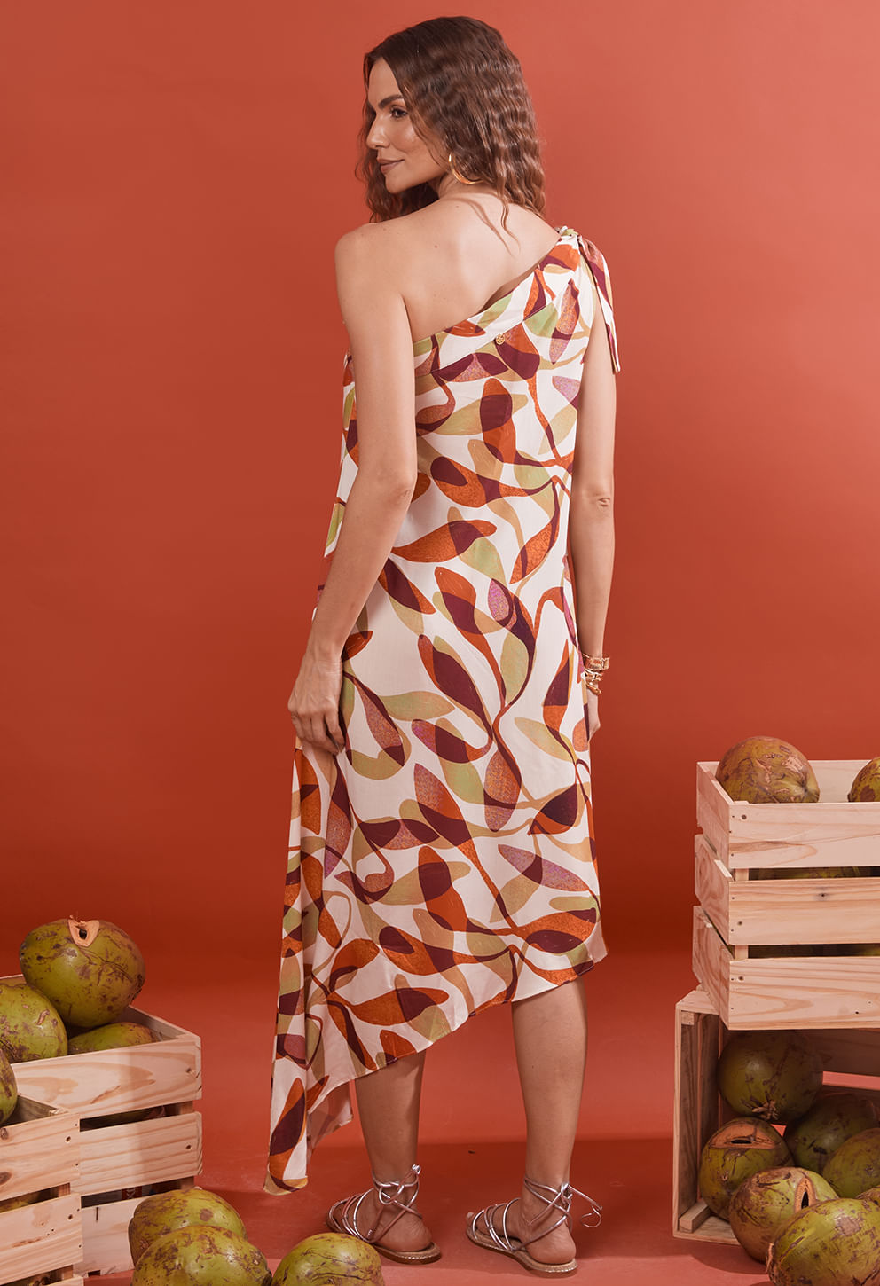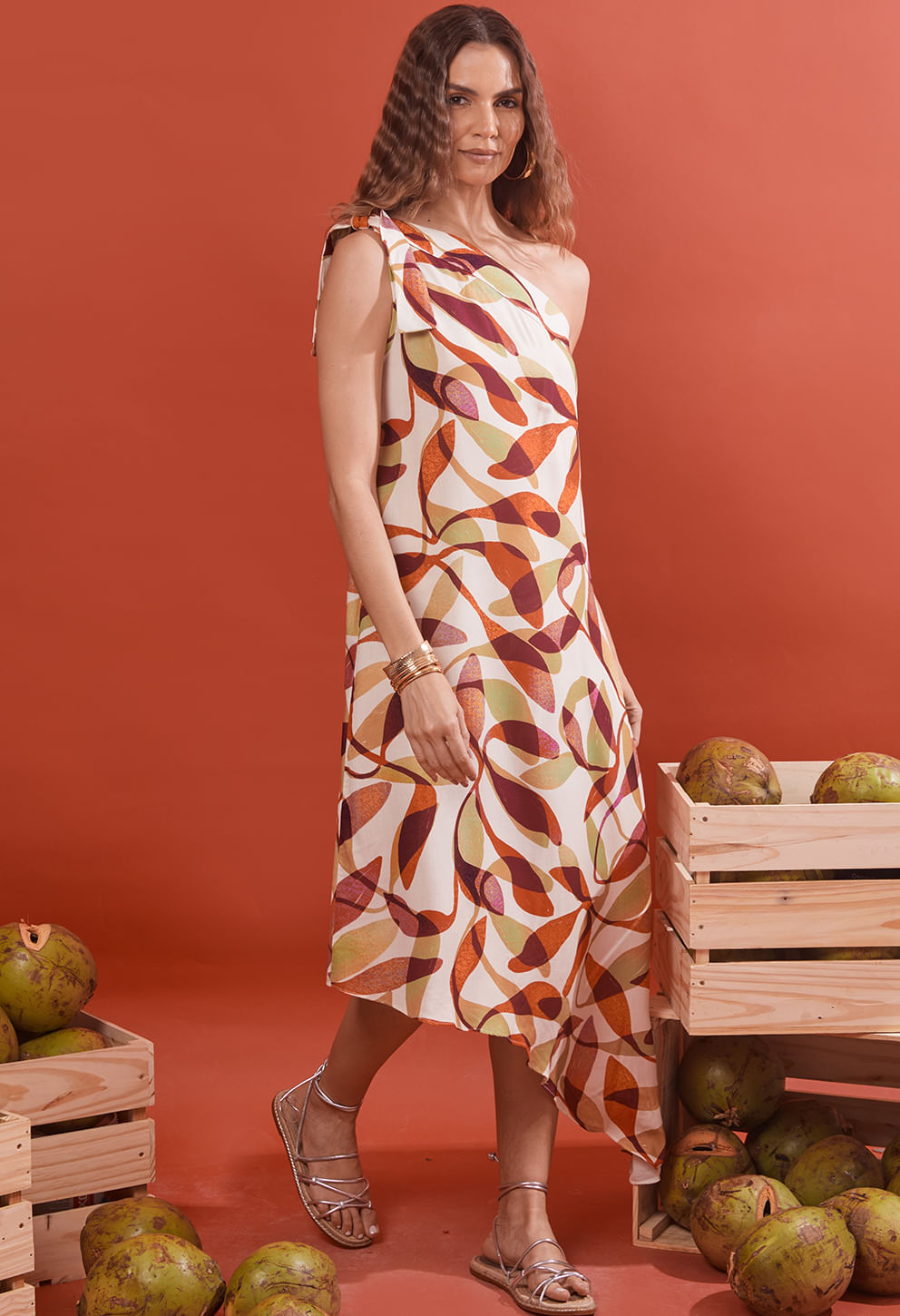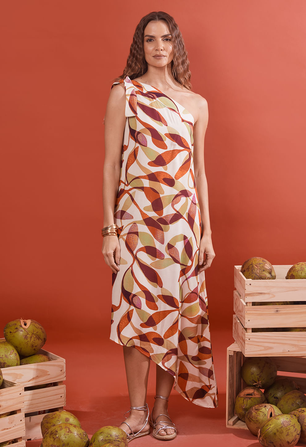+Vestido Pietra Cajueiro com amarração no ombro e caimento fluído, perfeito para dias ensolarados com sofisticação. Estampa abstrata e acabamento com a